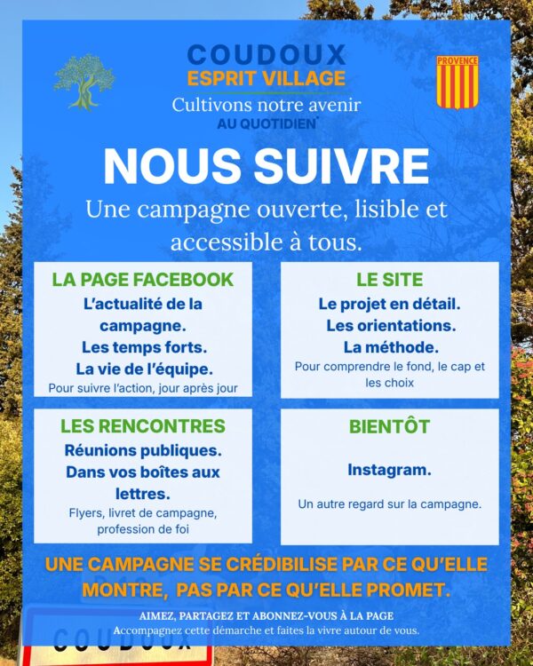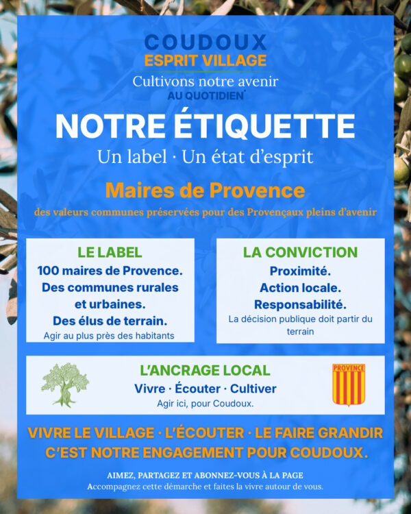 À Coudoux, nous avons fait un choix simple et cohérent.Nous faisons campagne sous le label des Maires de Provence. Ce label n’est pas une étiquette partisane, c’est une 𝗱𝗲́𝗺𝗮𝗿𝗰𝗵𝗲 𝗽𝗮𝗿𝘁𝗮𝗴𝗲́𝗲 par des maires de terrain, venus d’horizons différents, mais réunis… Lire la suite → |