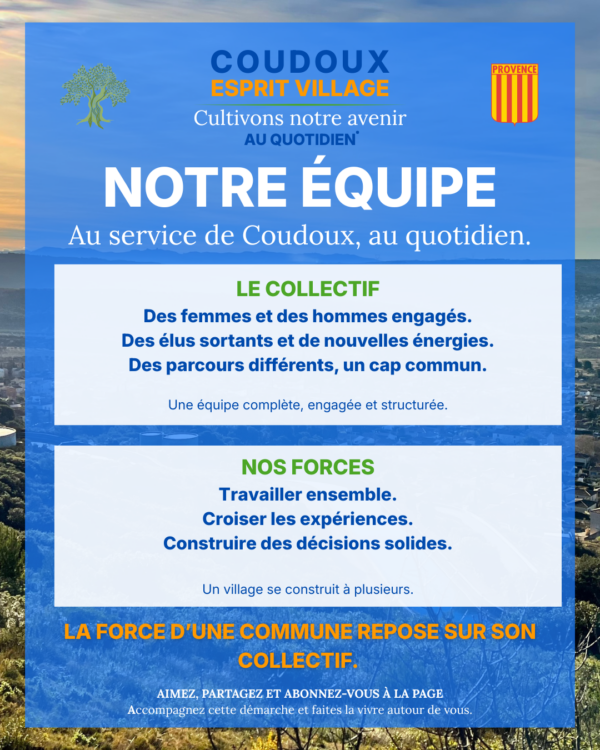 UN PROJET DÉJÀ TRAVAILLÉ, PRÊT À ÊTRE PARTAGÉ AVEC COUDOUX Coudoux Esprit Village : Une équipe engagée sur le terrain, jour après jour, pour faire avancer concrètement Coudoux. Article publié le 21/12/2025 |